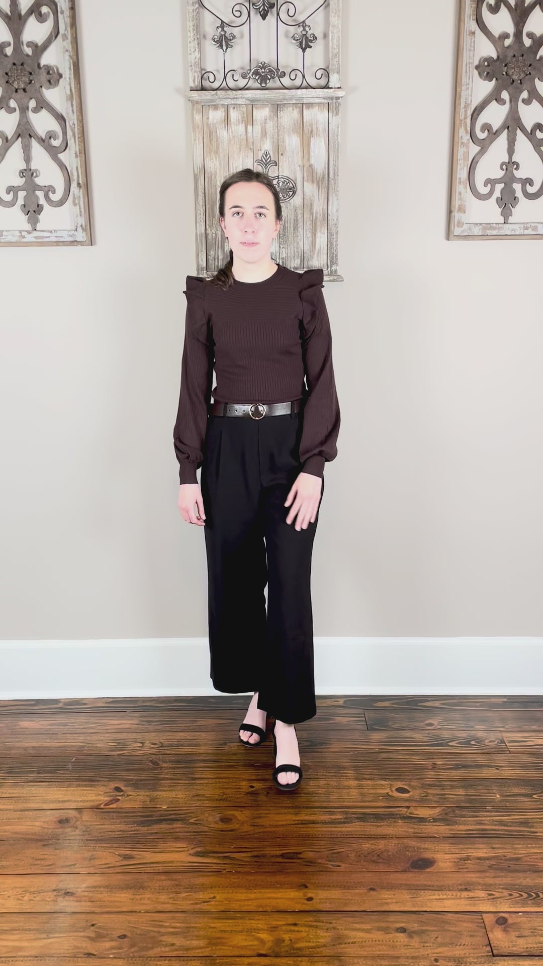 This lovely ribbed sweater is extremely soft yet durable. It could be dressed up with a pair of black pants or it could be dressed down a bit with a pair of dark jeans. The ruffle on the sleeve adds a fun extra detail.